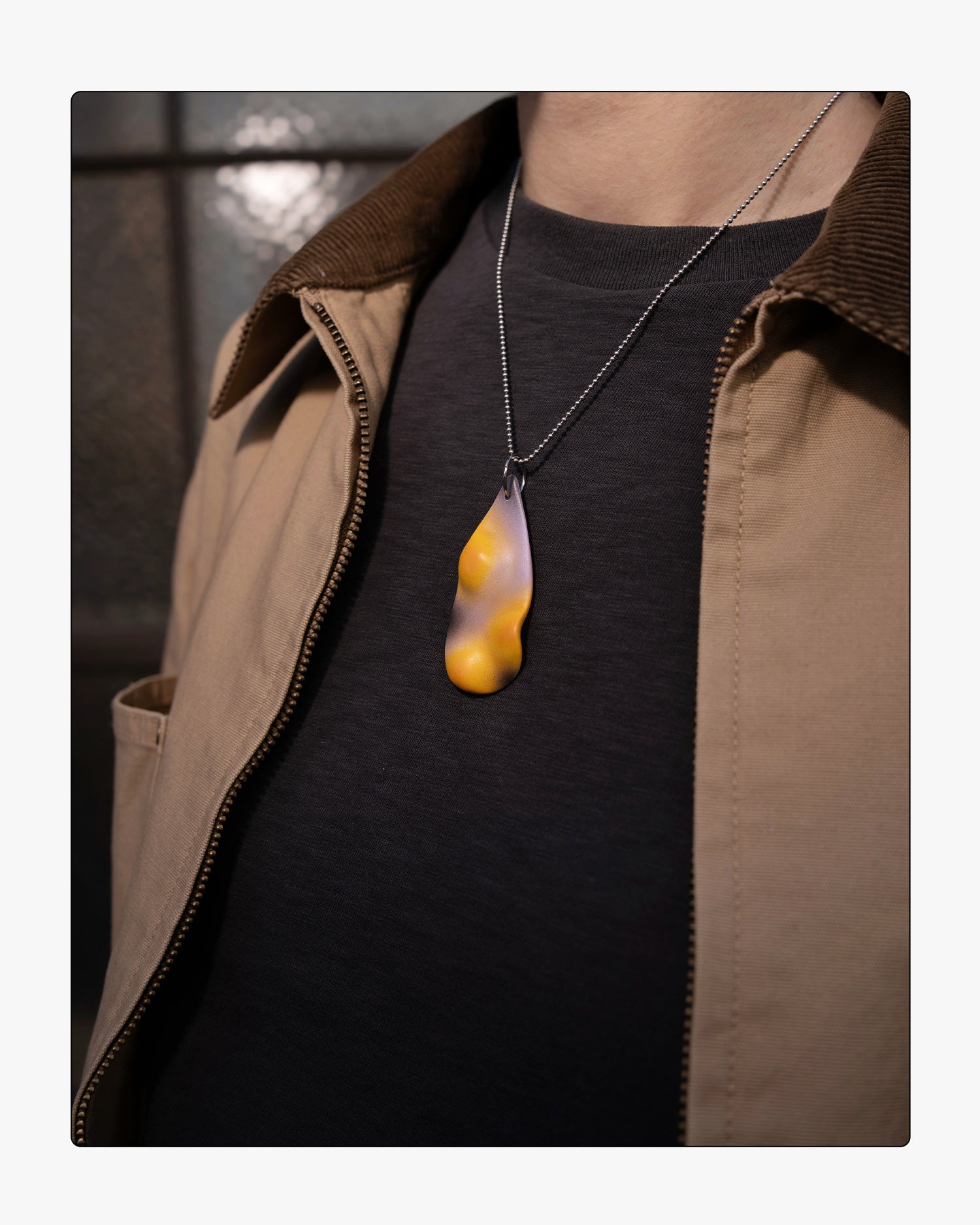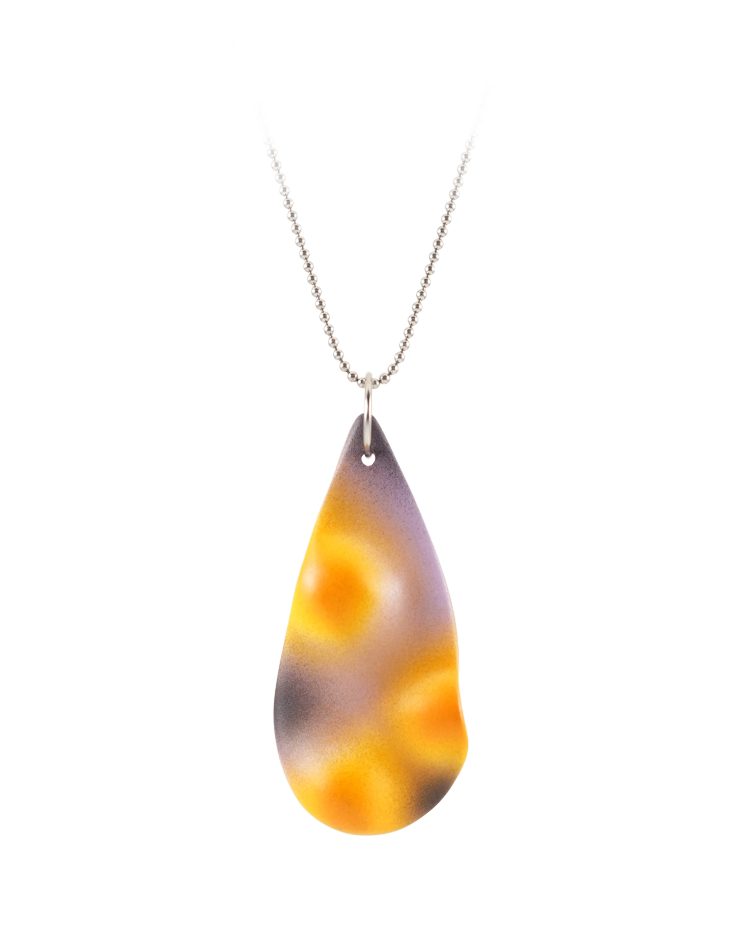 Ceramic wavy teardrop necklace, airbrushed in soft pink & yellow, with hints of black. 925 sterling silver ball chain. Each piece is carefully cast and painted by hand. Pigments are hand mixed in order to achieve beautifully vibrant colors, and as such, individual batches may have slight differences in shade.