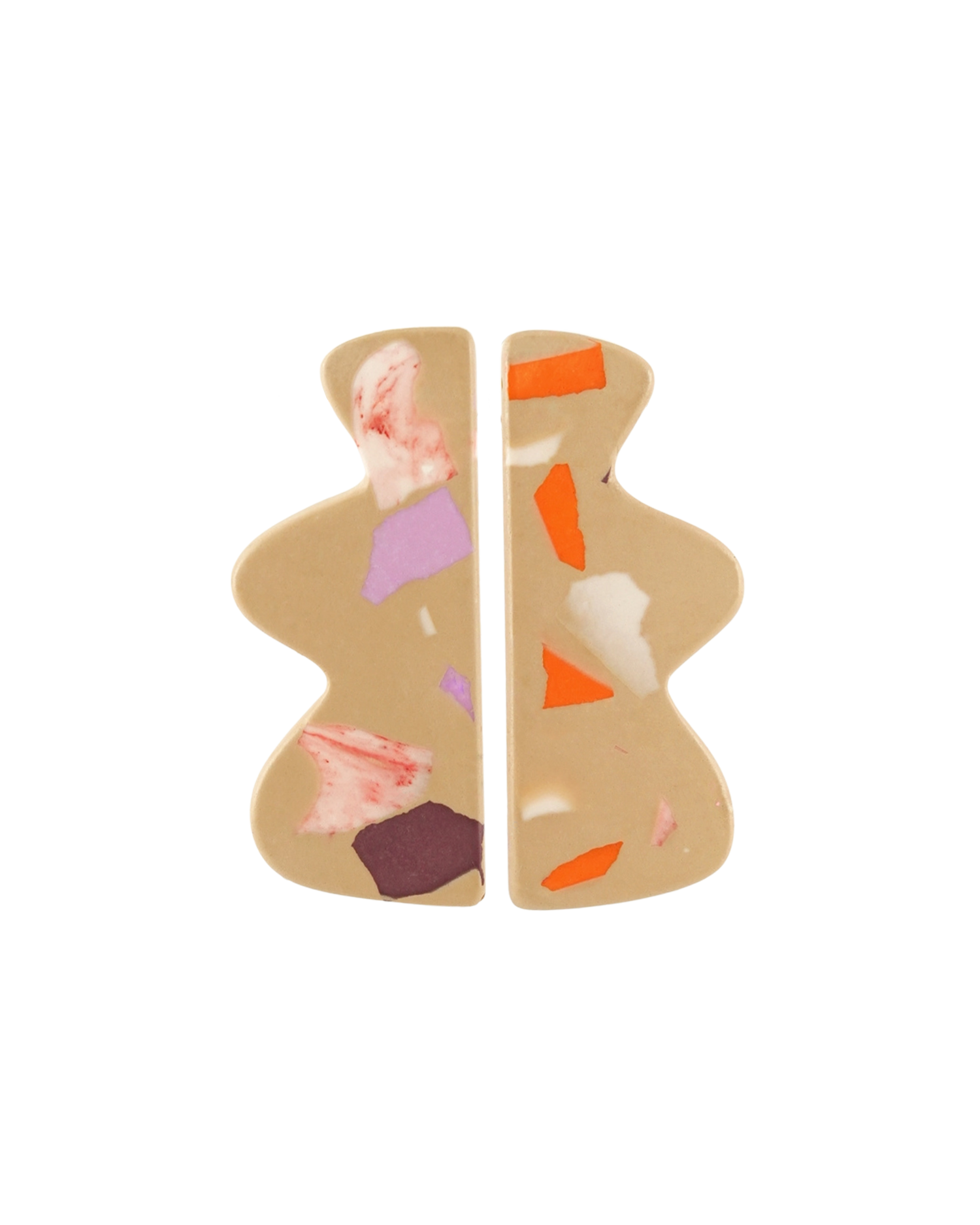 Abstract ceramic shapes with terrazzo detail in shore. As each piece is carefully hand cast and pigments are hand mixed for every batch, each earring will be one of a kind and will vary slightly in shade and overall appearance. Placement of terrazzo chips is unique to each piece.